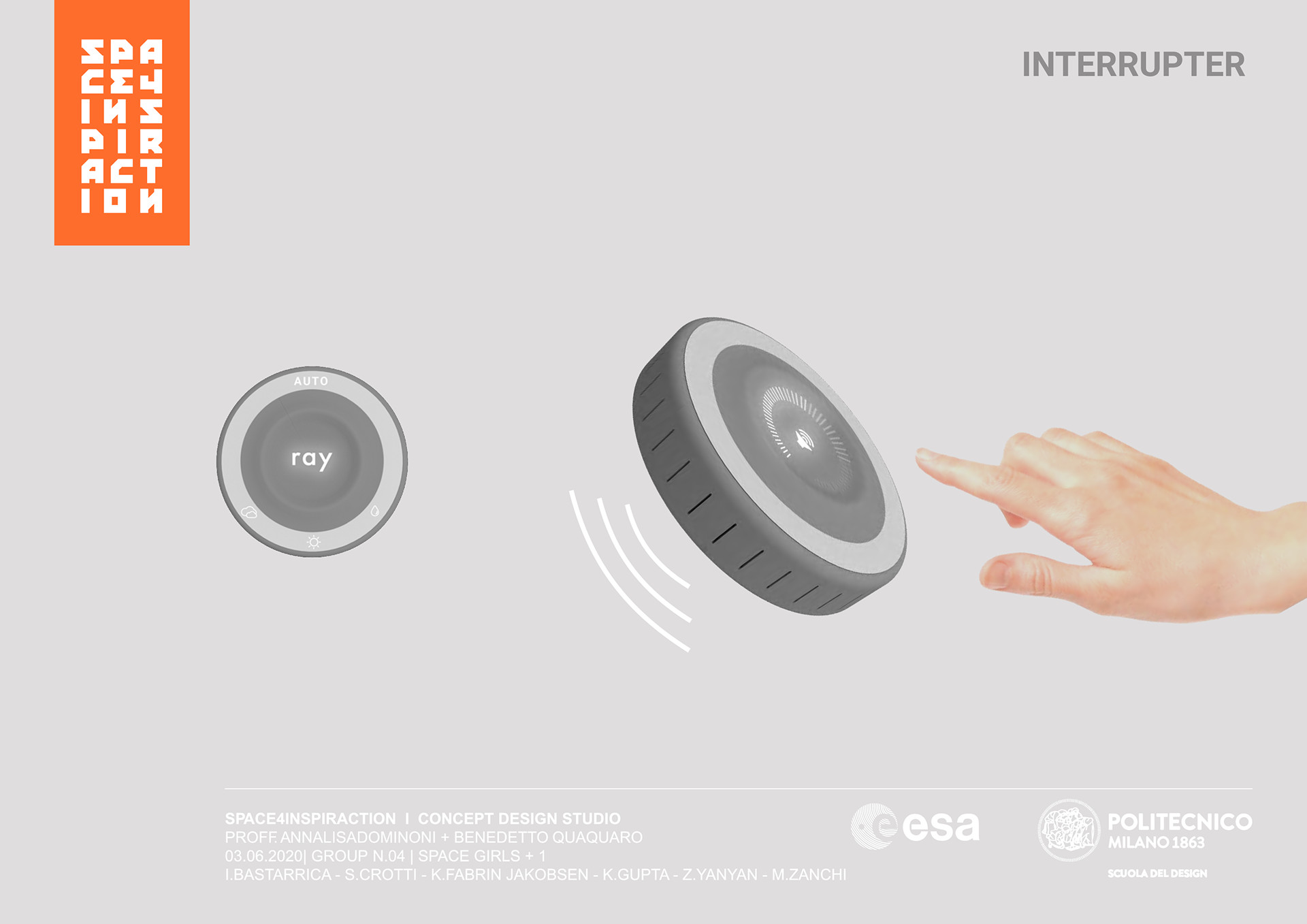 Polimi, European Space Agency and Foscarini, Concept Design Studio, 2020. "In Caravaggio's paintings you only see light. I dont' know where the switch is" -Bruno Munari. Ray is a lighting concept design for the International Space Station in collaboration with ESA and the lighting company Foscarini. The project has been developed starting from the idea of bringing natural light on board, exploiting it as a tool to increase the astronauts’ wellbeing. Light transforms the modules from aseptic spaces into cozy rooms, which emote the familiar feeling of home. In particular, light projections are used to depict the reflections given by hypothetical windows, giving the illusion of being in a room with openings. The lighting system is easily integrated in the current lighting system present on board. An OLED screen is placed inside a cylindrical rotating mask with cut-outs. They mimic the temperature and the intensity of natural light using shadows. Selected by the European Space Agency to be prototyped at the Swiss Space Center. ray. let the sun in.
